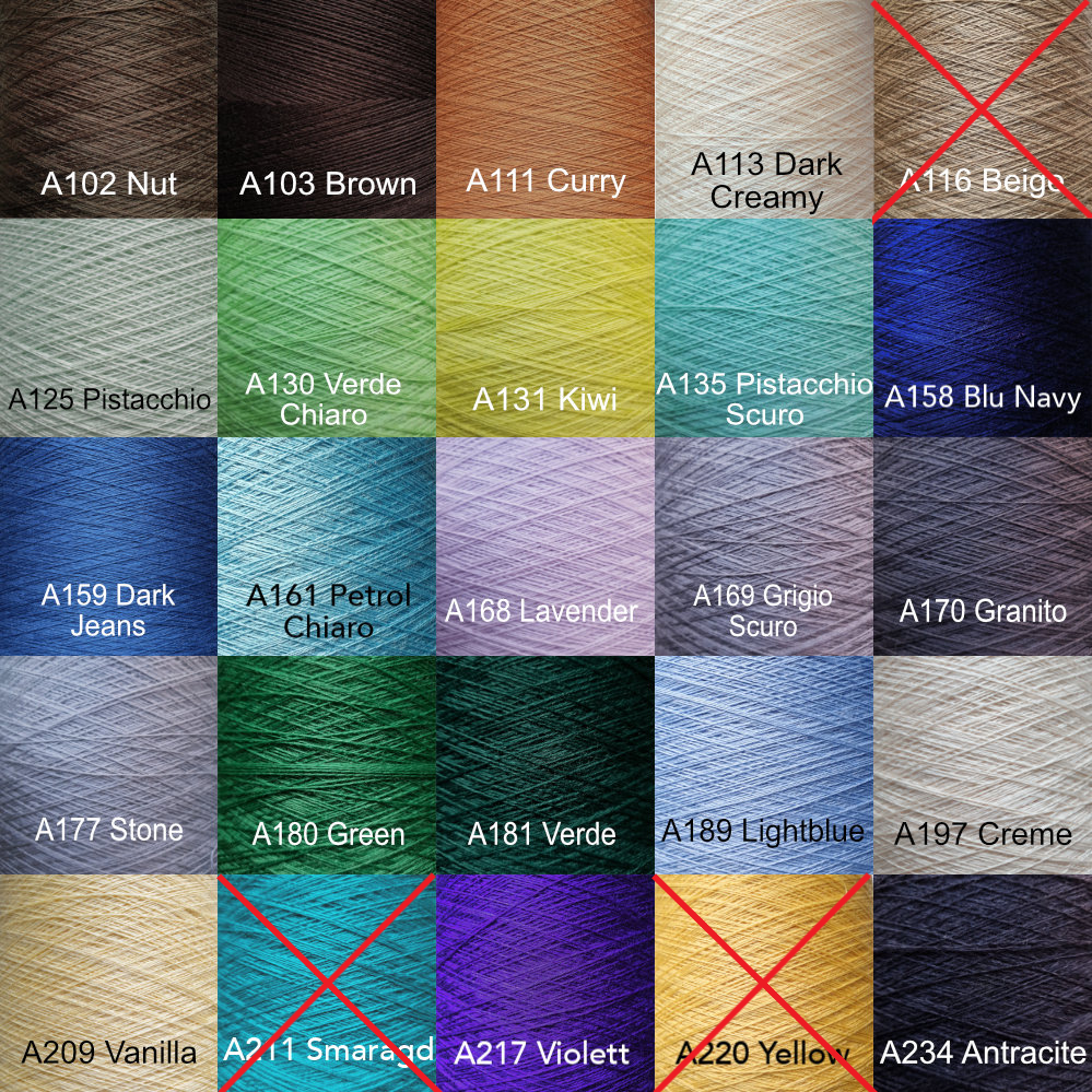 A125 Pistacchio – pistazie • • A130 Verde Chiaro – hellgrün • • A131 Kiwi – kiwi • • A135 Pistacchio Scuro – dunkle pistazie • • A158 Blu Navy – dunkelblau