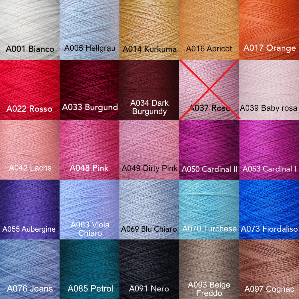 A022 Rosso – rot • • A033 Burgund – burgund • • A034 Dark Burgundy – dunkles burgunderrot • • A037 Rose – hellrosa (vorübergehend nicht verfügbar) • • A039 Baby rosa – hellrosa