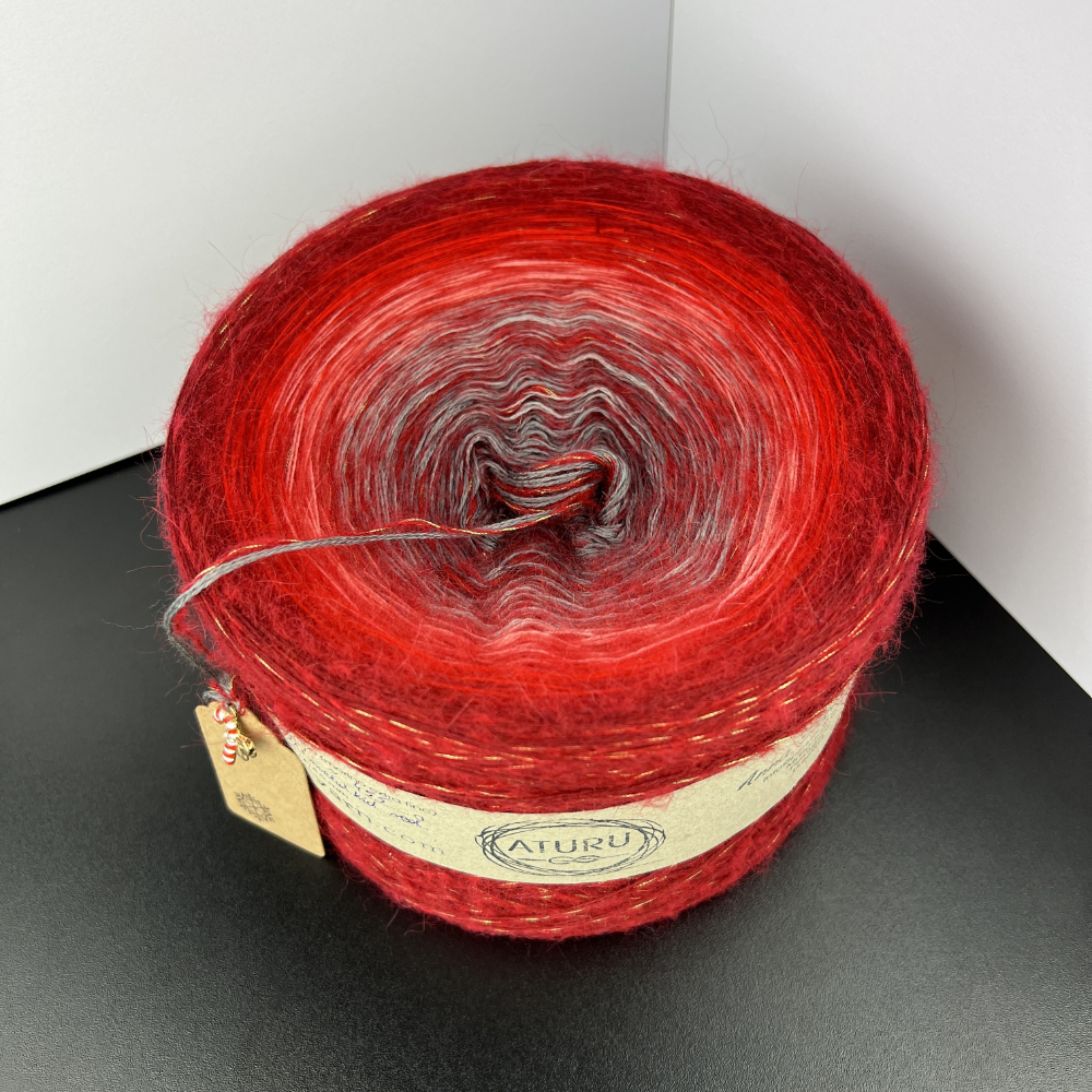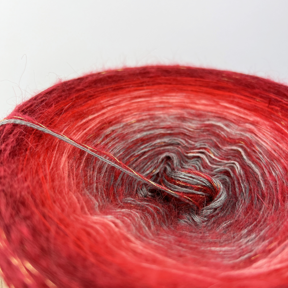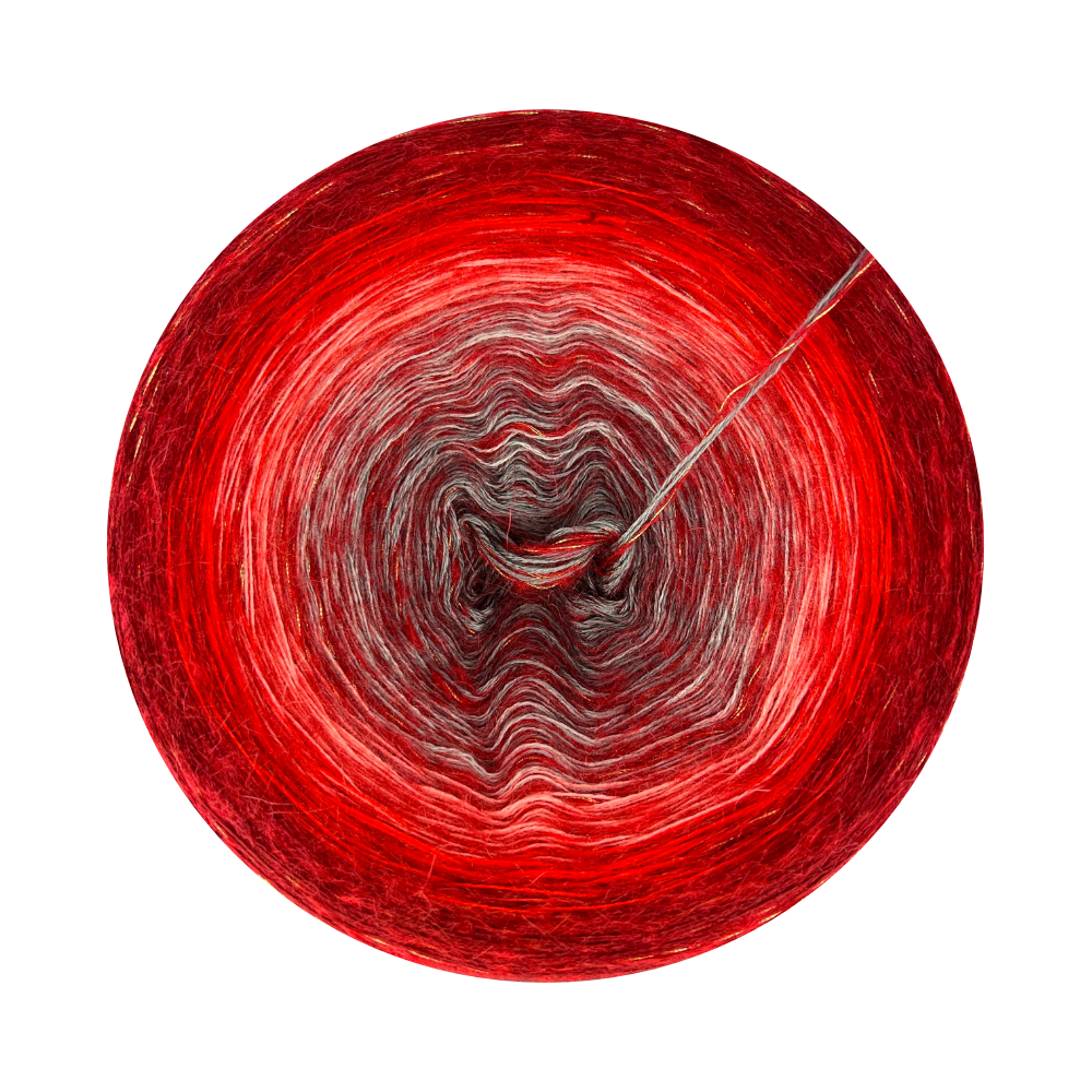Farben: A169 Grigio Scuro – dunkelgrau • A177 Stone – grau • A042 Lachs – lachs • A022 Rosso – rot • A033 Burgund – burgund • A034 Dark Burgundy – dunk. burgunderrot + metal kid rot/gold als Beilaufgarn