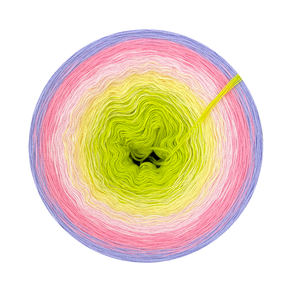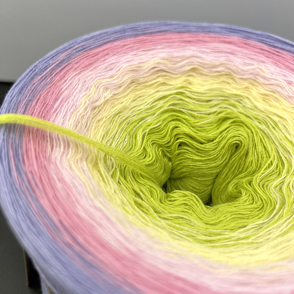 Handgewickeltes Farbverlaufsgarn. Alle Knäuel machen wir mit grosser Sorgfalt. Die Farben wechseln sich fließend, immer nur ein Faden auf einmal. Die Knoten sind sehr klein und fast unsichtbar.