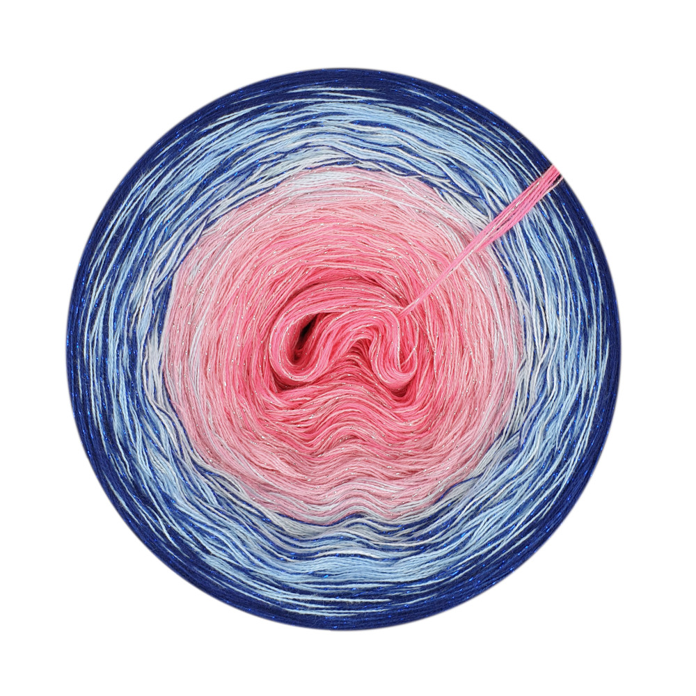 Farben: 420 – candy • 585 – rosa • 020 – hellblau • 365 – aqua • 055 – royal + rosa/silber und dunkelblau/blau als Beilaufgarn (Glitzerfaden)