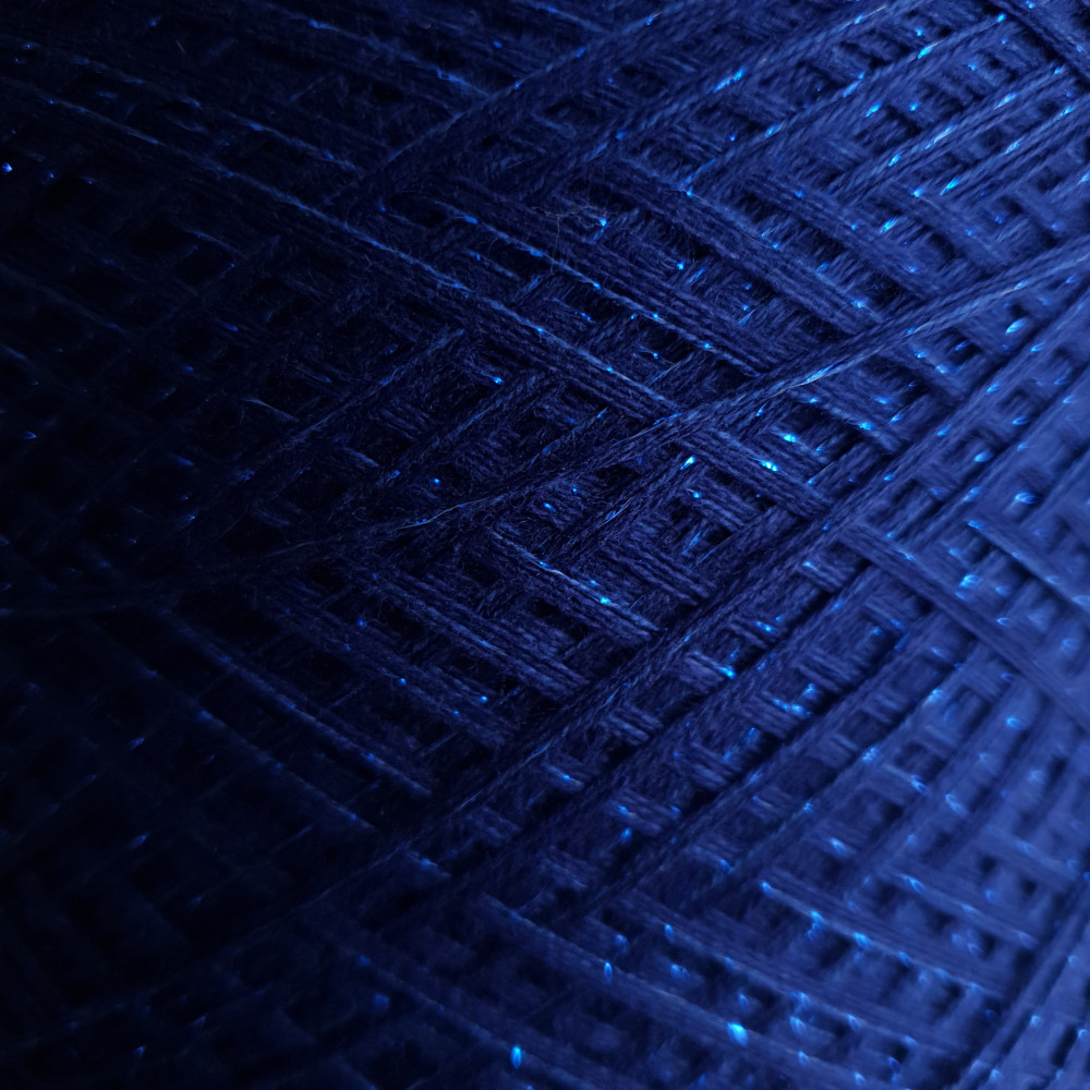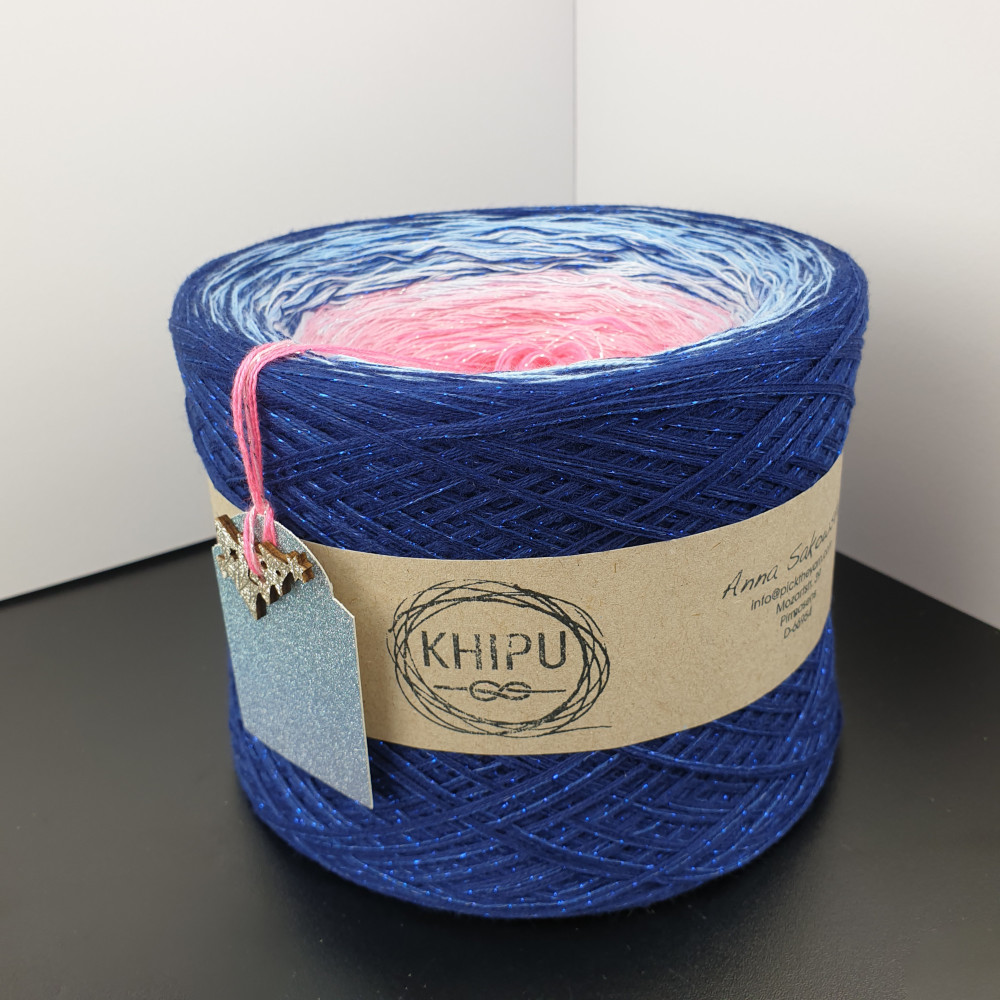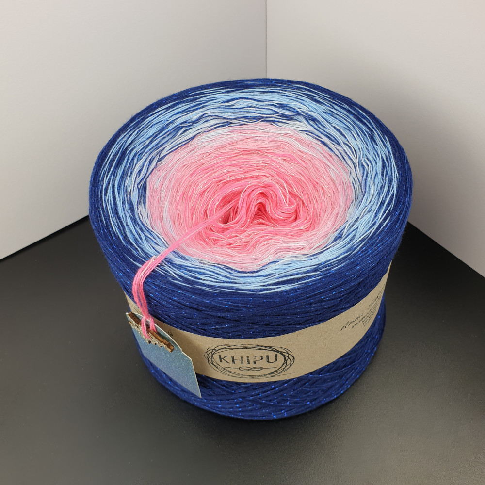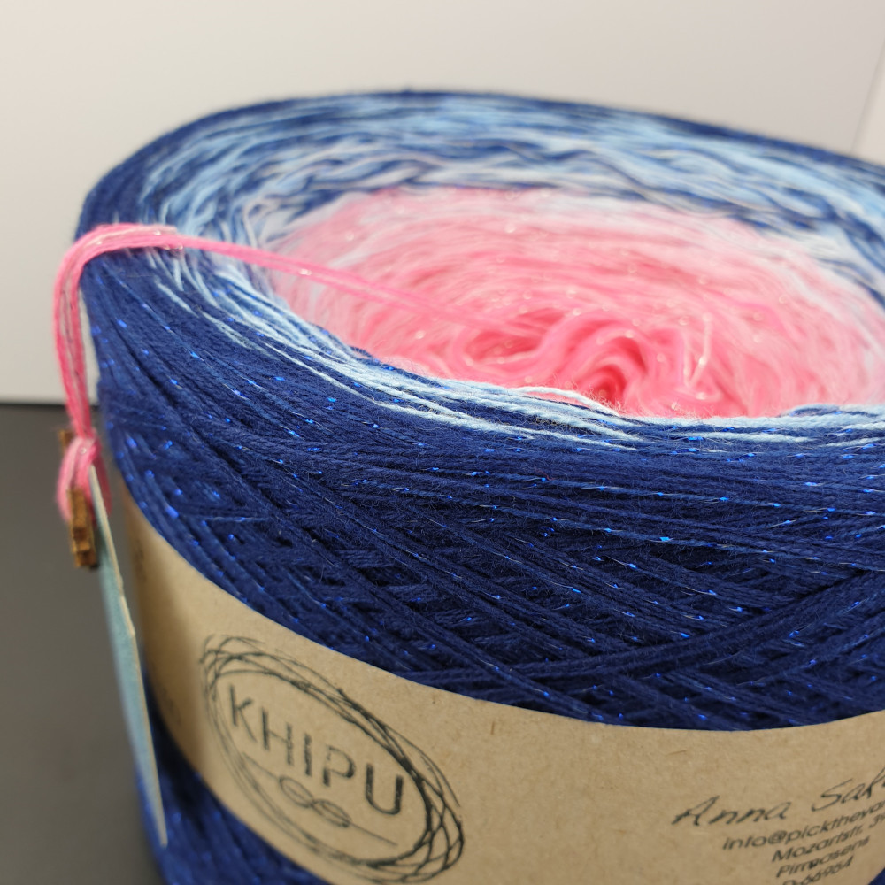 Der Bobbel Dominique, 141, hat einen Beilauffaden, der am Anfang in rosa mit silbernem Glitzer, später in dunkelblau auch mit blauem Glitzer ist.