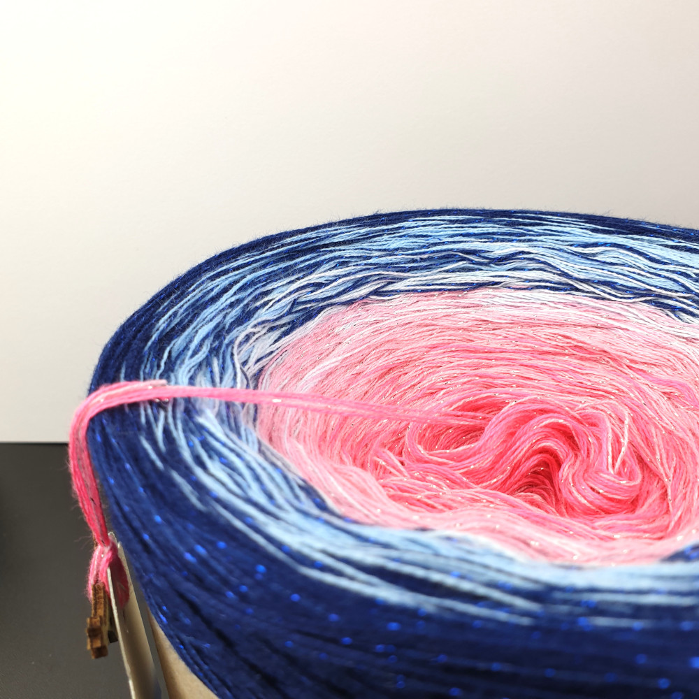 Handgewickeltes Farbverlaufsgarn. Alle Knäuel machen wir mit grosser Sorgfalt. Die Farben wechseln sich fließend, immer nur ein Faden auf einmal. Die Knoten sind sehr klein und fast unsichtbar.