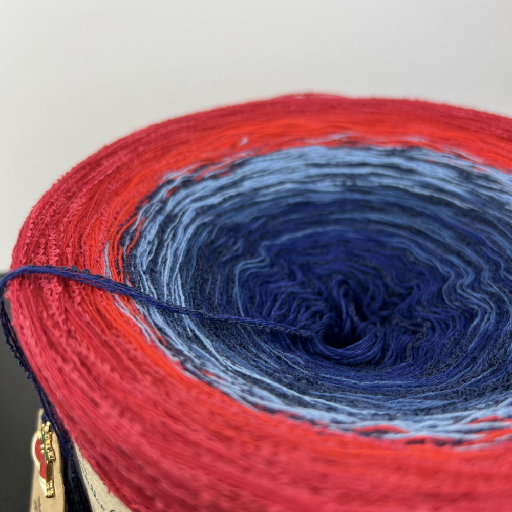 Der Beilauffaden wechselt in der Mitte des Bobbels die Farbe. An dieser Stelle befindet sich ein Knoten, bei dem ich die Enden bewusst etwas länger gelassen habe, damit er sich nicht löst. Der Faden ist sehr dünn, daher werden diese längeren Enden in der fertigen Handarbeit nicht sichtbar sein.