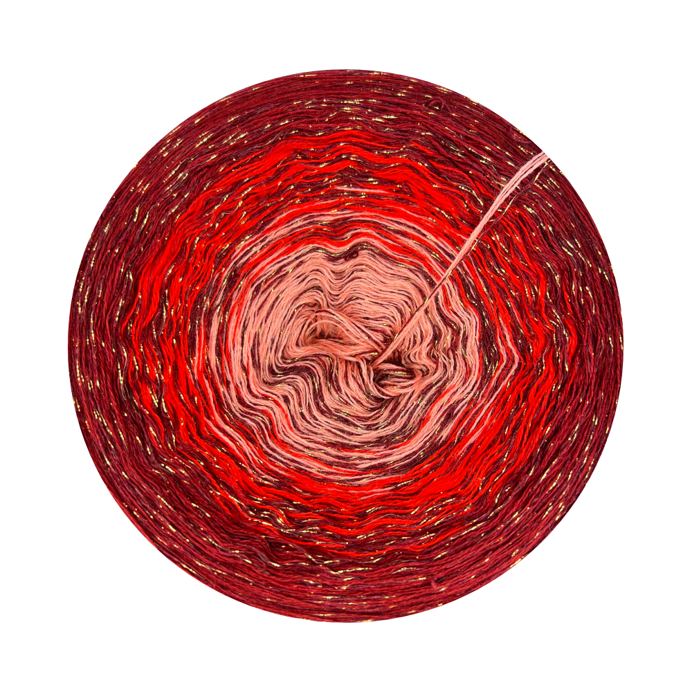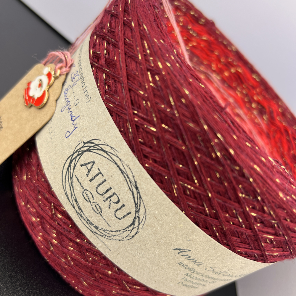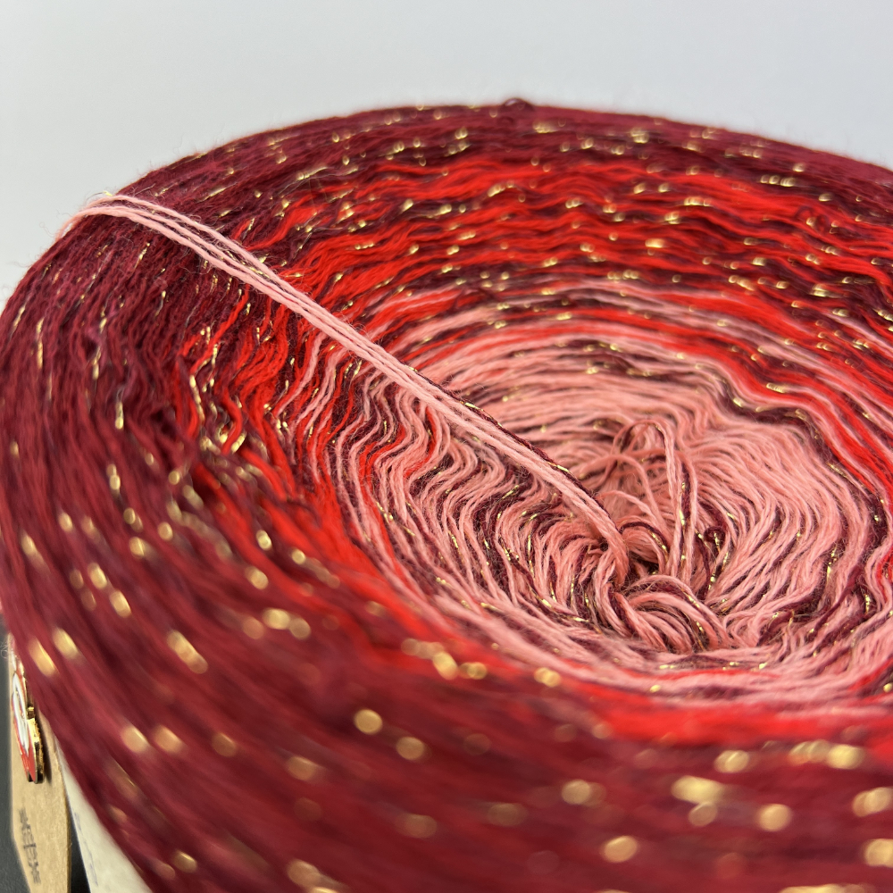 Kolory: A042 Lachs – łososiowy • A022 Rosso – czerwony • A033 Burgund – burgund • A034 Dark Burgundy – ciemny burgund + lucchino w kolorze czerwonym ze złotym połyskiem przez całą długość motka